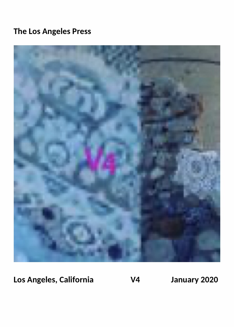 Volume 7 V7 The Los Angeles Press Edited by Linda Ravenswood With visual art, poetry, essay from Malado Francine, Bayley Sprowl, Kayleigh Metviner Zaloga, Elya Braden, Anna Talhami, Henry Cherry, Jacqueline Suskin, Cindy Rinne, L Bogner, The Micky’s WeHo Slam / Top 4 Poets, Alex Dark, Marquesha Babers, Raul Herrera, Marcos James, Paolo Gambi, Erin Jourdan Berrios, Nailah Porter, Jon Pearson, Brian Sonia Wallace, Aubrey Yarborough, Jackie Braje, Yvonne Estrada, Ben Simmonds, Jessie Lian, Christina Cha cover by Paulo Gambi, Ravenna, 2022 $18.95 plus $6.95 shipping and handling to all the 50 states