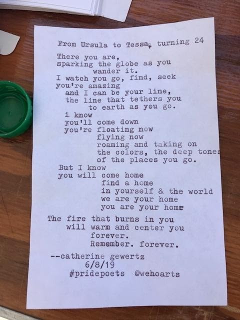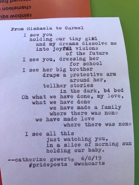Barely audible over the music and noise from all the LA Pride festival booths around us, she whispered “I have a secret.” I leaned in. “Nobody knows I’m here. I left my house at 9 am today and took 3 buses to get here. It’s my first pride.” I was covering the typewriters while the #PridePoets were on break. I felt the immense pressure of writing a poem that was a worthy match to the secret she had told me. I thought back to my own first pride many, many years ago, trying to recall the heady mix of emotions I had that day. Clack, clack, clack. I hand her the poem and watch her face as she read it. She starts to cry and whispers thank you and gives me a hug.